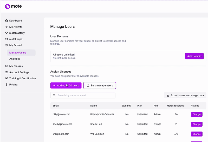 If you would like to allocate a new license to your staff members (or your students), use Mote's 'Manage Users' option.