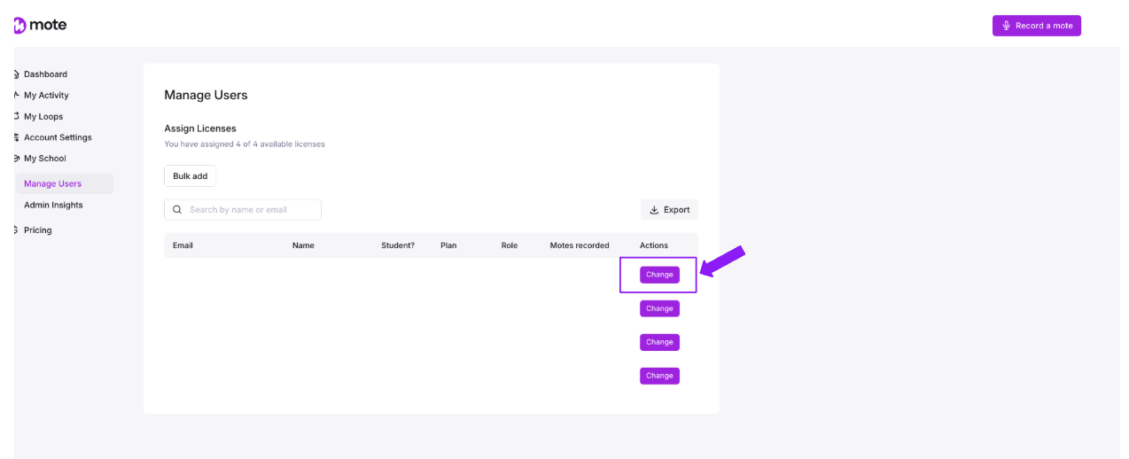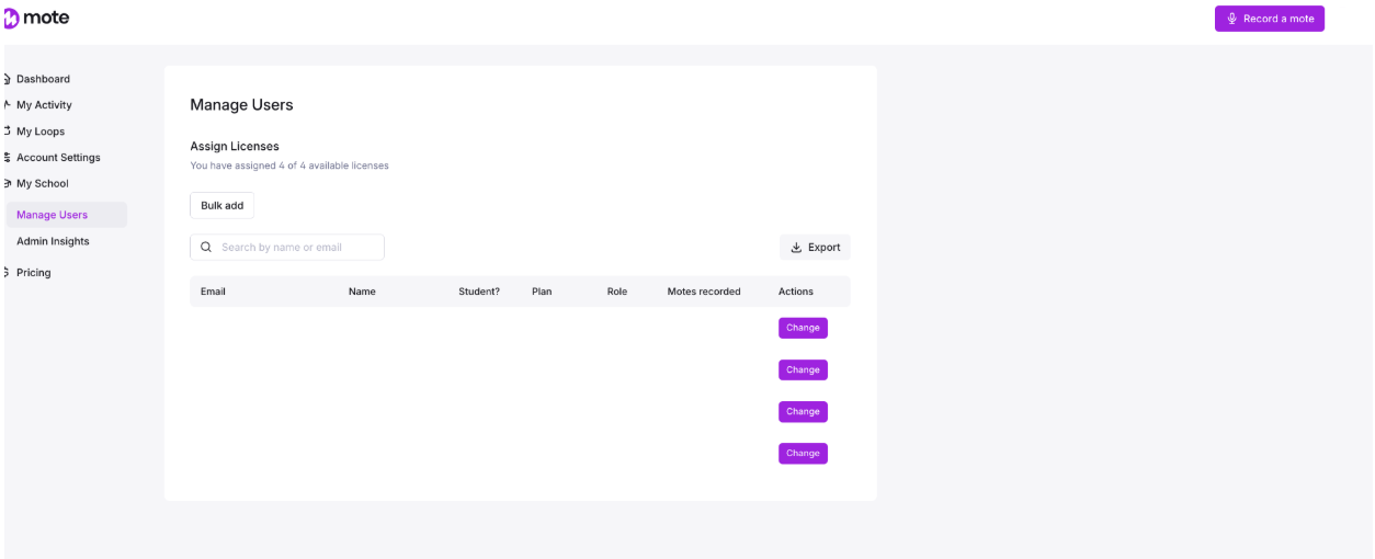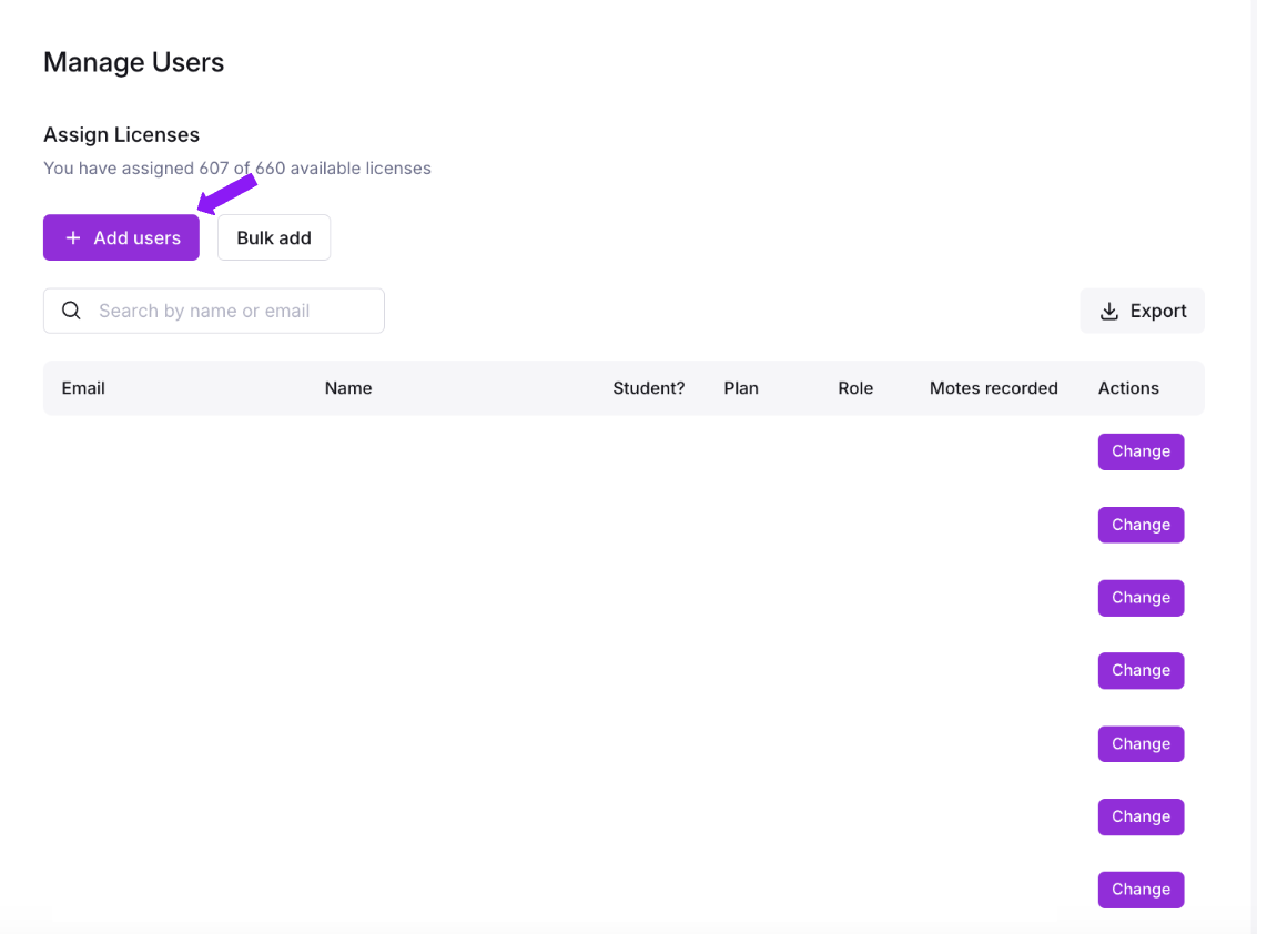 If you can't see the 'add users' button, it is probably because you have assigned all of your seats! You can either add additional licenses to your account by emailing us at support@mote.com or by removing licenses from existing users.