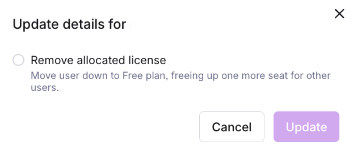 To remove existing seats, click 'change' next to the user you want to remove, and then select remove allocated license in the pop-up: