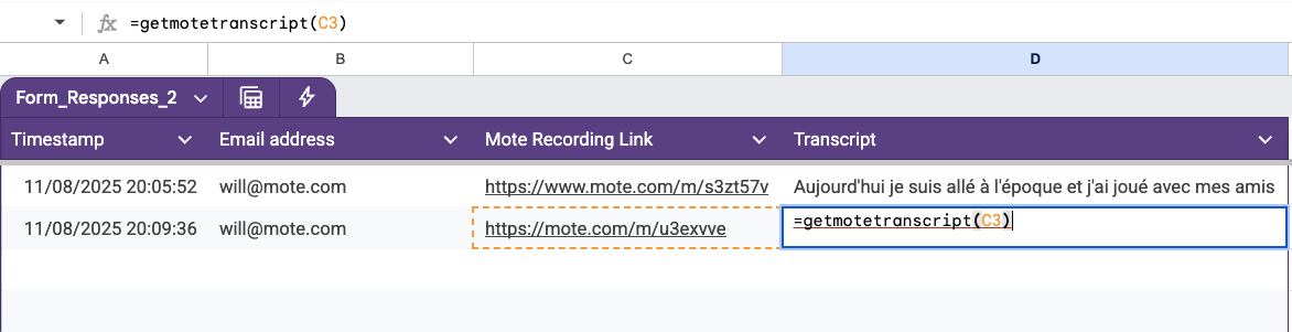 If you're trying to extract transcripts from a list of Mote recordings, here's a quick and easy fix using an Google Apps Script.