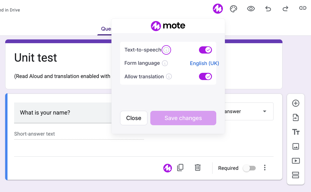 When you select 'Add text-to-speech' we register your Form's identifiers in our systems, and ensure that anyone who accesses the Form will have automated read aloud audio. We also add some text to the Form description (e.g. "Read aloud enabled with Mote"), which is required for our Chrome Extension to work. Please do not remove this text 😀.